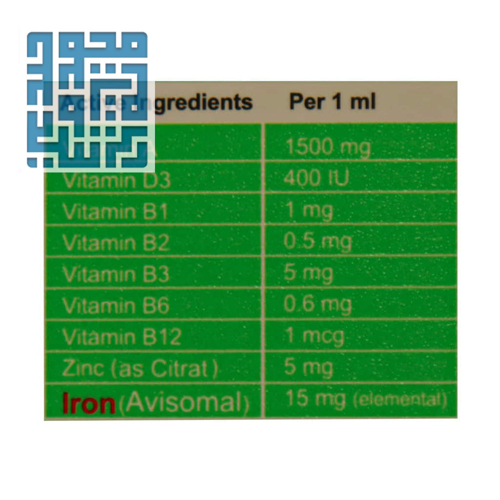آهن آویزومال موجود در قطره مولتی آویفر آویوال به مقدار 15 میلیگرم در هر میلیلیتر از نوع لیپوزومال است و جذب بالایی دارد. این فرم آهن باعث کاهش مشکلات گوارشی و جلوگیری از سیاه شدن دندانها میشود. آهن در ساخت هموگلوبین، پیشگیری از کمخونی و تأمین انرژی سلولی اهمیت دارد.