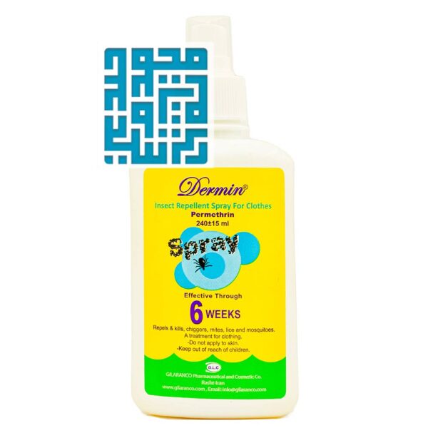 اسپری دافع حشرات درمین طراحی شده برای محافظت از وسایل شخصی مانند لباس، چادر مسافرتی، بالش و پتو در برابر حشرات اثر ماندگاری بیش از ۶ هفته را ارائه میدهد. این اسپری دارای پرمترین است، یک عامل قدرتمند که شپش و سایر حشرات را بهسرعت فلج میکند و از بین میبرد.