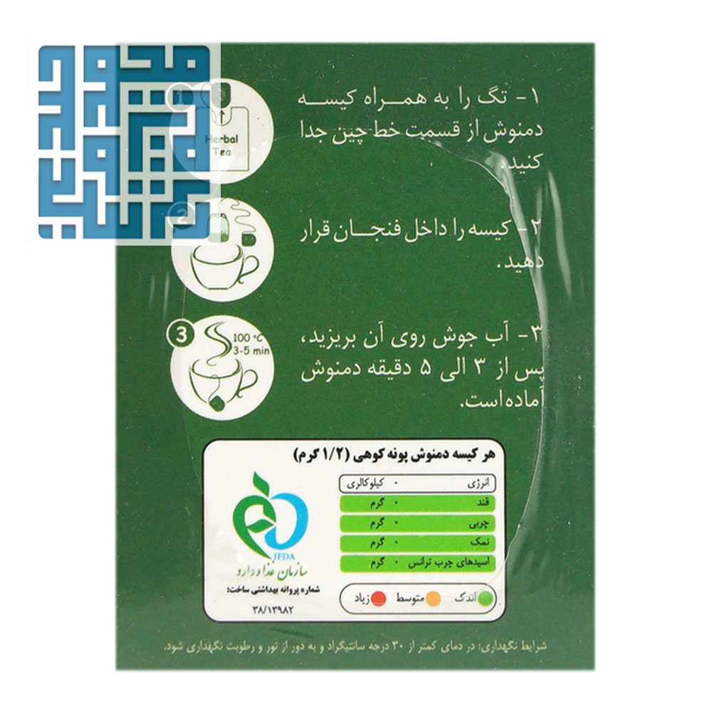 آب جوش روی آب بریزید، پس از 3 الی 5 دقیقه دمنوش آماده است.
