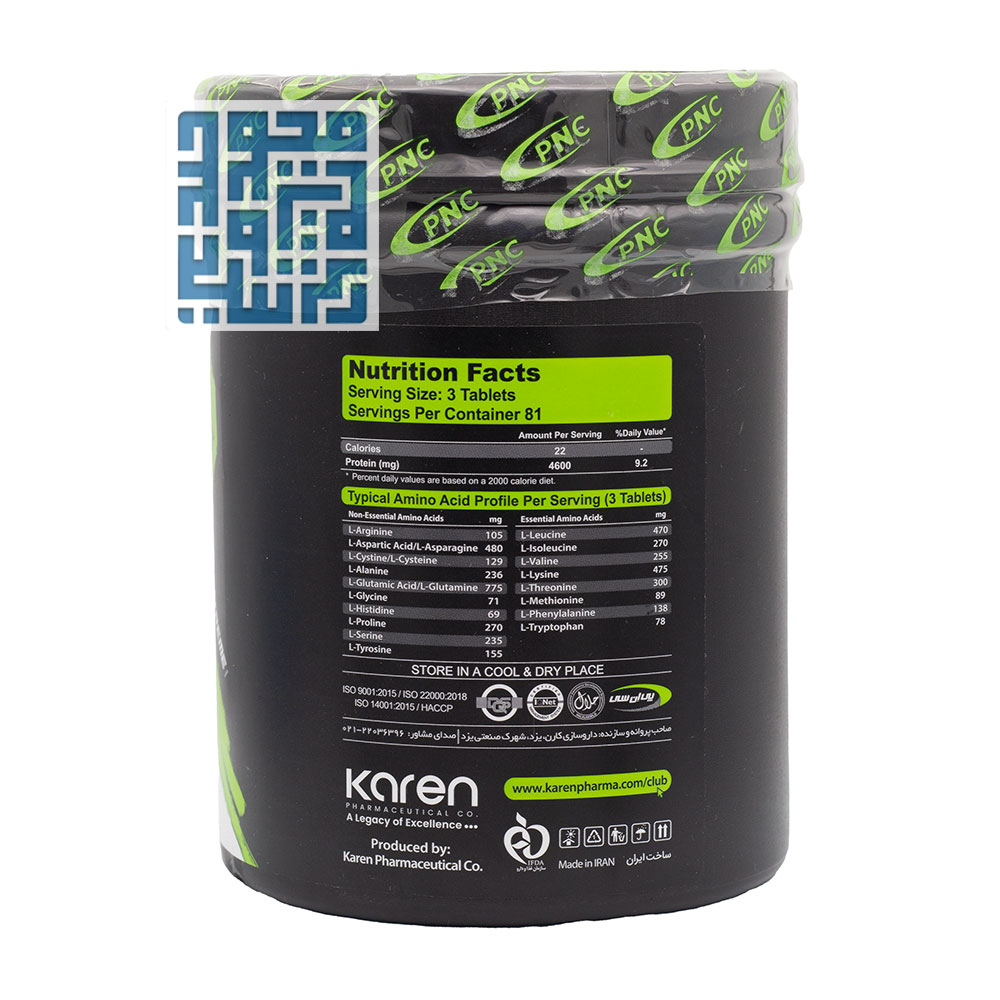 کد بهداشتی این محصول، ۷۱۲۹۵۵۰۰۱۷۷۱۳۶۸۶، نشاندهنده رعایت استانداردهای سختگیرانه تولید است. شرکت کارن که یکی از تولیدکنندگان برتر مکملهای ورزشی و تغذیهای در ایران محسوب میشود، این محصول را در دسته مکملهای آمینو قرار داده است.