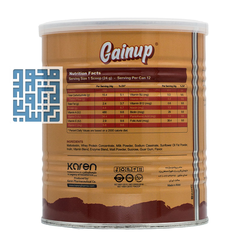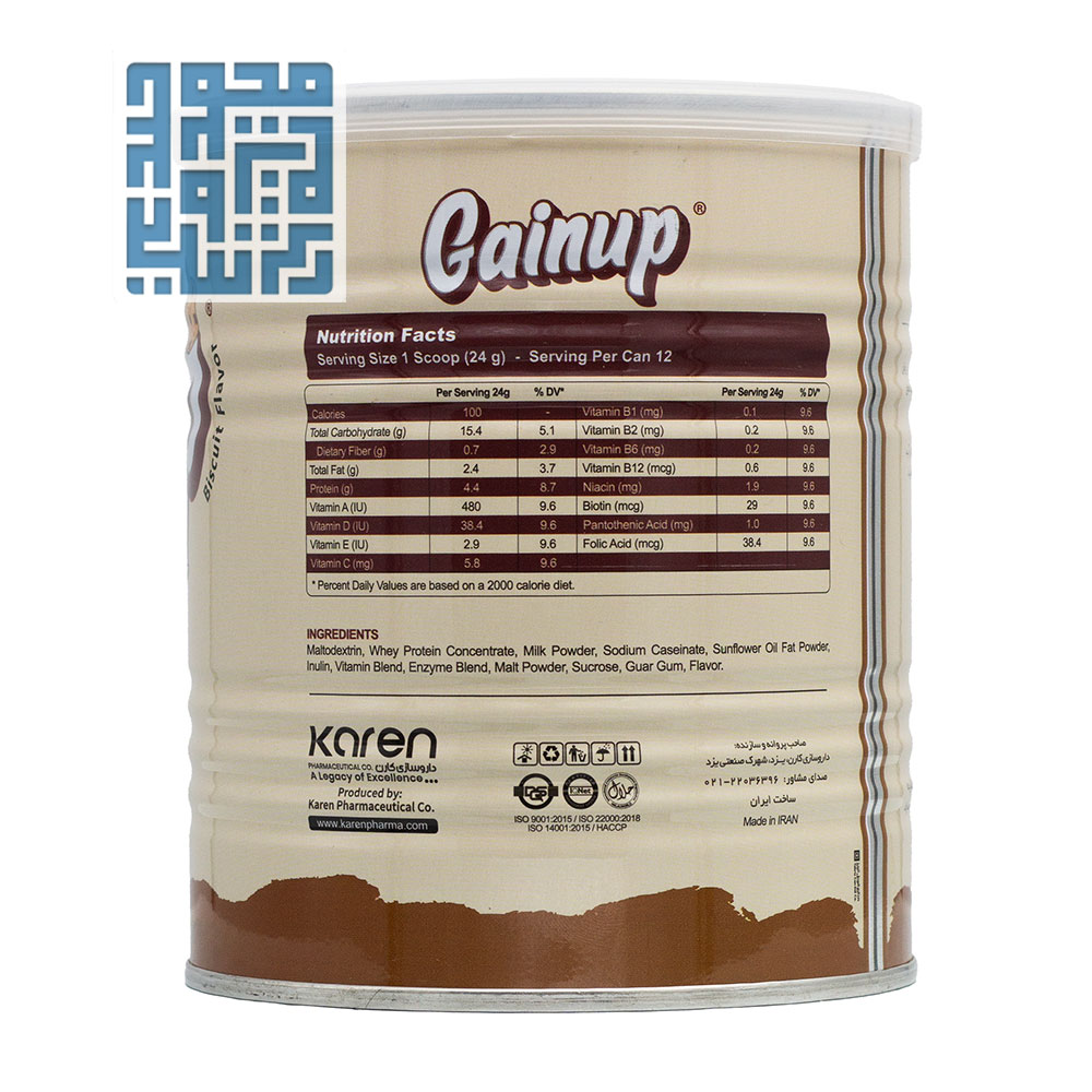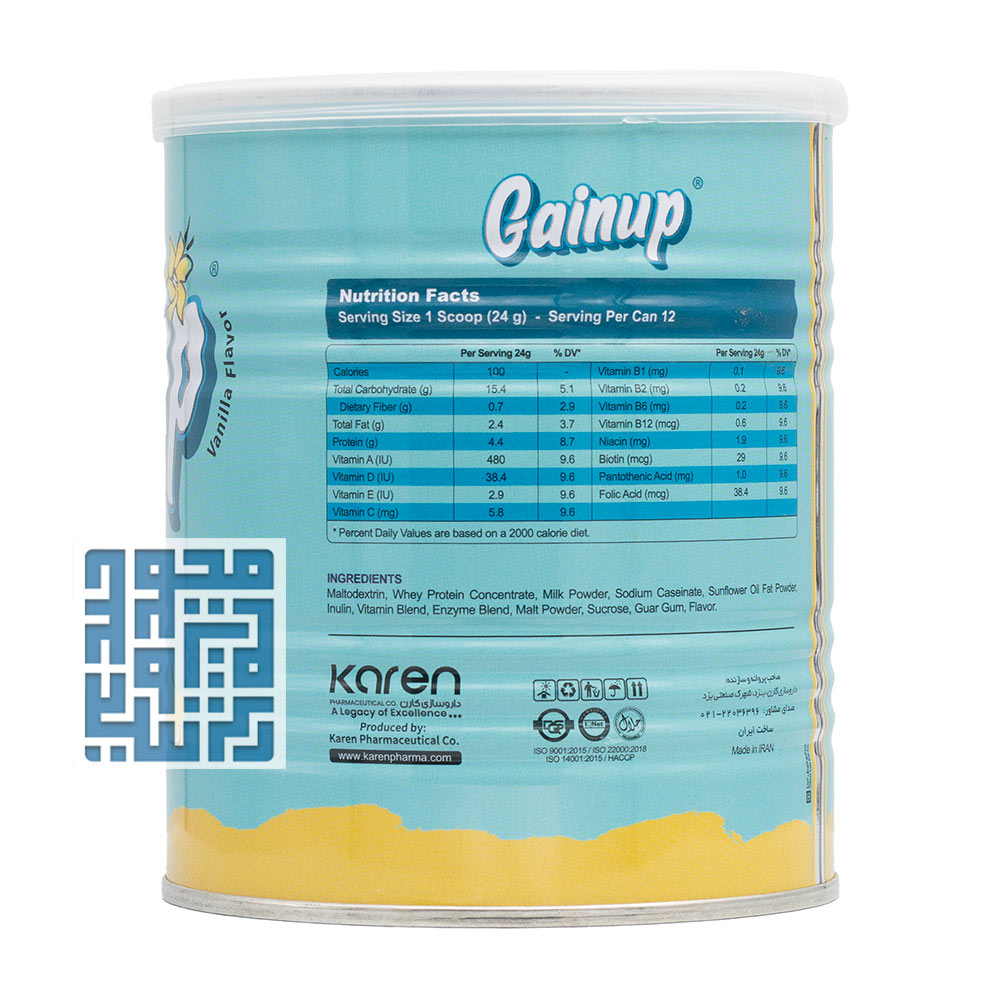 گین آپ 12 نوع ویتامین برای تأمین نیاز روزانه دارد. این محصول کم لاکتوز است. به افزایش وزن کودکان بی اشتها، لاغر و بدغذا کمک میکند. همچنین، در کودکان کموزن و دچار سوءتغذیه و کودکانی که نمیتوانند تنها از طریق غذا نیاز خود را تامین کنند، به تامین انرژی روزانه و پروتئین کمک میکند.