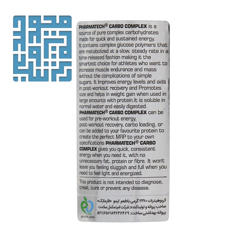 مکمل گربوهیدرات کمپلکس فارماتک محصول برند Pharmatech بوده و در قوطی پلاستیکی ۲۲۷۰ گرمی عرضه میشود. شکل فرآورده پودری است و دو طعم پانچ میوه و لیمویی تجربه مصرف را ساده و دلپذیر میکند. کشور تولیدکننده ایران و شرکت امید مکمل سلامت مسئول ساخت آن است.