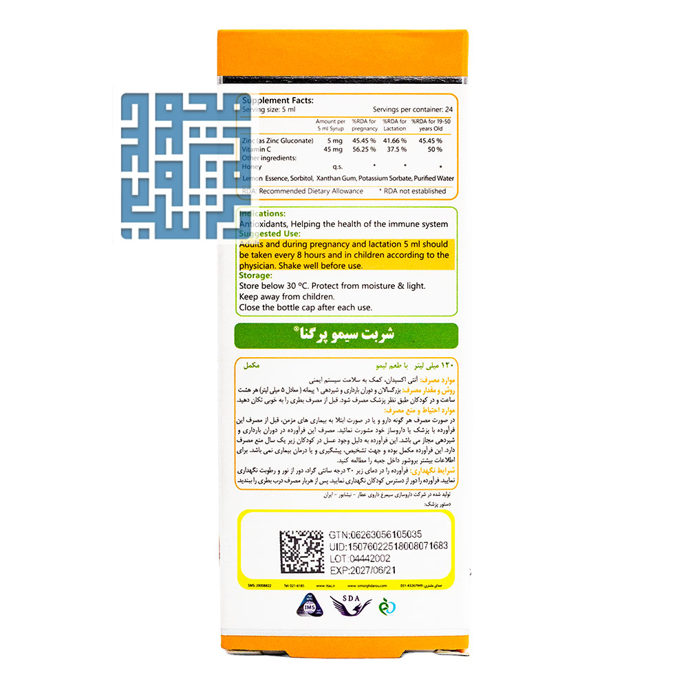 این محصول مکملی است که برای تقویت سیستم ایمنی و کاهش علائم سرماخوردگی مورد استفاده قرار میگیرد. زینک، ویتامین سی و عسل موجود در آن باعث تسکین سرفه و التهاب گلو میشوند. شربت سیمو پرگنا سیمرغ دارو عطار در دوران بارداری و کودکی ایمن است.