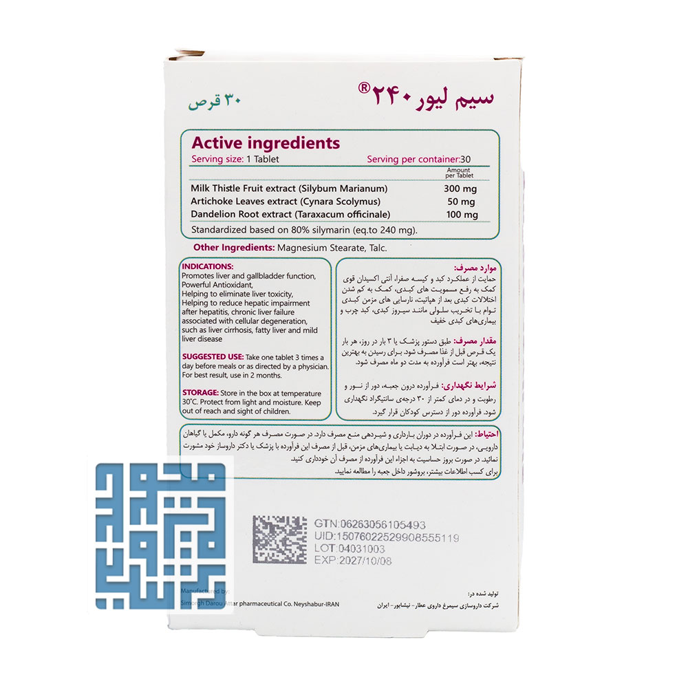 ترکیبات قرص سیم لیور 240 سیمرغ دارو عطار 30 عدد