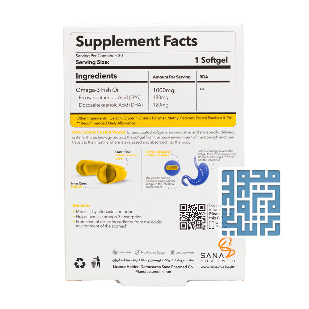 سافت ژل اسمارت امگا ساناویوا یک مکمل تغذیهای بر پایه روغن ماهی است که با بهرهگیری از مقادیر استاندارد EPA و DHA، به جذب مطلوب امگا ۳ در بدن کمک میکند. با مصرف منظم این محصول، پشتیبانی از سلامت قلب، مغز و سیستم ایمنی در کنار کنترل چربی های خون فراهم میشود.